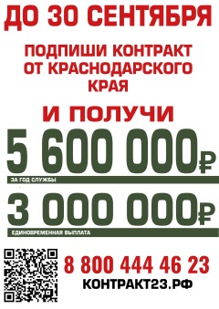 ![]() 24.09.2025 В Краснодарском крае действуют одни из самых выгодных условий для заключения контракта с МинобороныДо 30 сентября размер единовременной выплаты при подписании контракта увеличен до 3 млн рублей. За первый год службы военнослужащий сможет получить до 5,6 млн рублейПреимущества подписания контракта в Краснодарском крае:- Трансфер из любого региона России- Оснащение современной экипировкой- Профессиональная подготовка и обучение- Бесплатное проживание и питание во время комиссии и оформления- Страхование жизни до 12 млн рублей- Получение статуса «Ветеран боевых действий»Более подробную информацию можно узнать на сайте: контракт23.