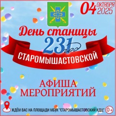 ![]() 27.09.2025 Праздничная программа: 231 год Старомышастовской!Приглашаем всех жителей и гостей станицы на масштабные праздничные мероприятия празднования Дня станицы Старомышастовской 4 октября!