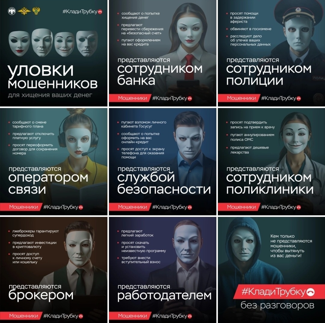 12.09.2025 Информационная кампания «Клади трубку» - создание безопасной цифровой средыВ современном цифровом мире кибермошенничество становится все более распространенным и угрожающим явлением. Каждый день миллионы людей по всему миру становятся жертвами мошенников, которые используют различные способы для обмана и кражи личной информации. Для борьбы с этим злом проводится информационная кампания «Клади трубку», направленная на повышение осведомленности об опасностях кибермошенничества и методах защиты от него.Часто мошенники представляются сотрудниками банков, компаний или государственных учреждений, чтобы заполучить доступ к конфиденциальным данным или совершить финансовое мошенничество. Поэтому важно помнить, что никогда не следует предоставлять личные данные или совершать финансовые операции по телефону или через интернет без проверки подлинности собеседника. В карточках — 8 самых распространённых в этом году приёмов мошенников. #КладиТрубку #Старомышастовскоесельскоепоселение