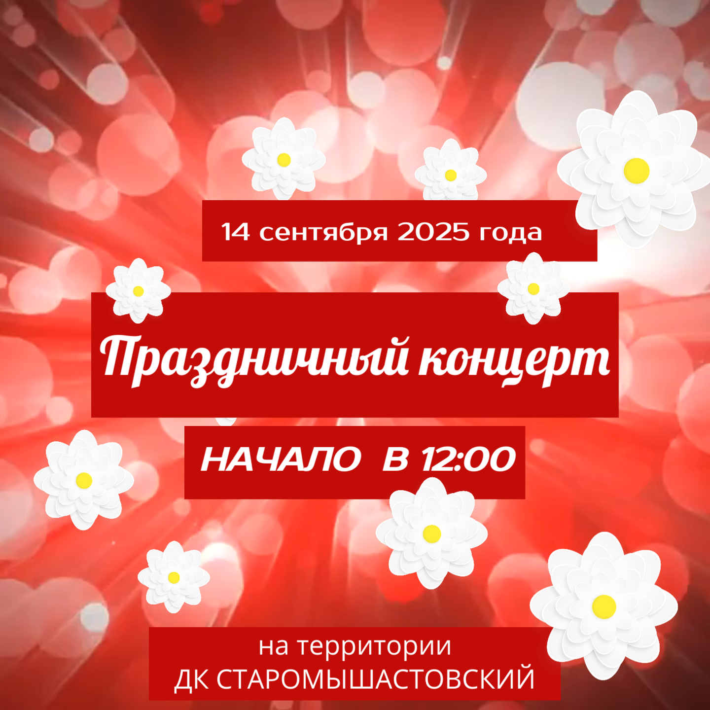 13.09.2025 Праздничный концерт!Уважаемые жители и гости Старомышастовского сельского поселения! В честь Дня образования Краснодарского края 14 сентября 2025 года состоится праздничный концерт!  Начало мероприятия в 12:00 часов на территории ДК СТАРОМЫШАСТОВСКИЙ Вас порадуют своими талантами творческие коллективы МБУК Старомышастовский КДЦ ЖДЕМ ВСЕХ!