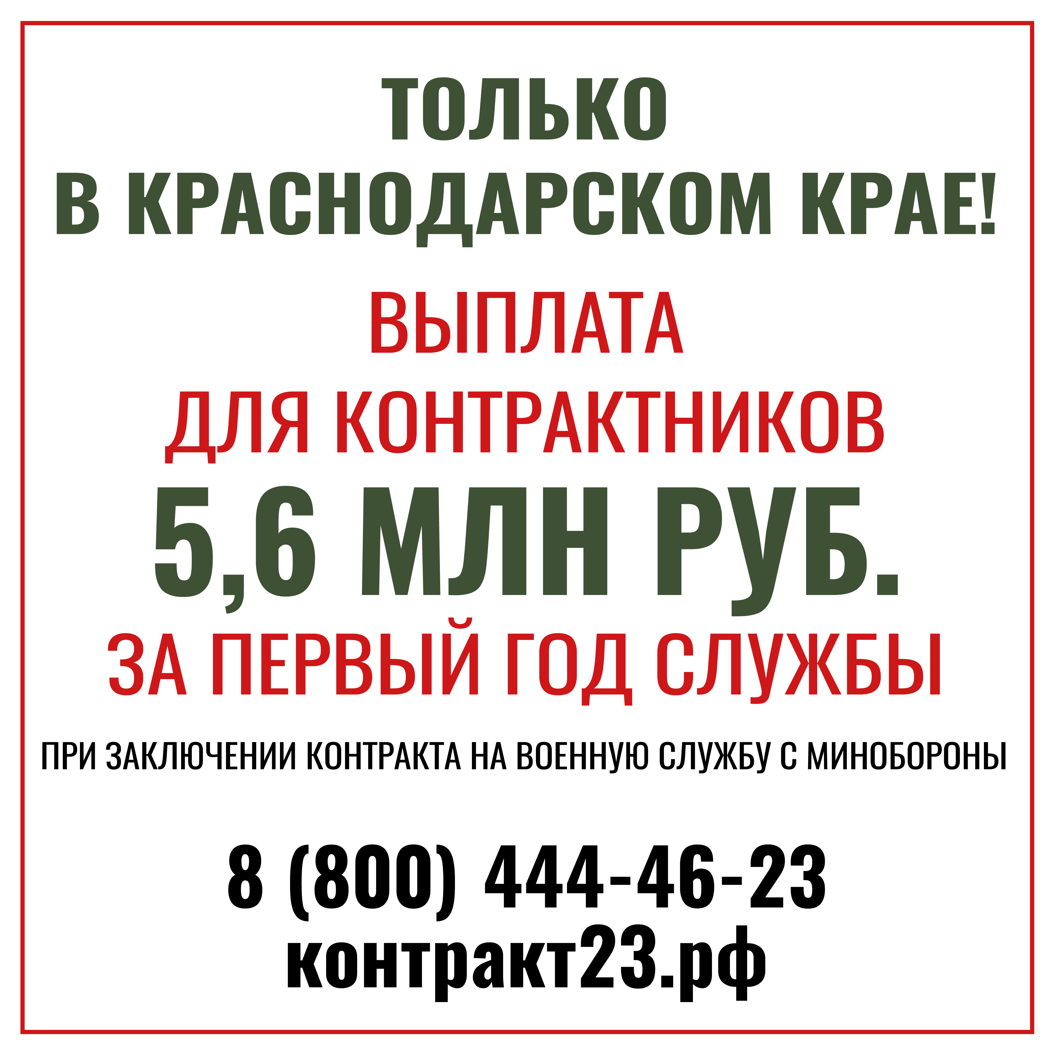 06.10.2025 В Краснодарском крае действуют одни из самых выгодных условий для заключения контракта с Минобороны!До 31 октября размер единовременной выплаты при подписании контракта увеличен до 3 млн рублей. За первый год службы военнослужащий сможет получить до 5,6 млн рублей