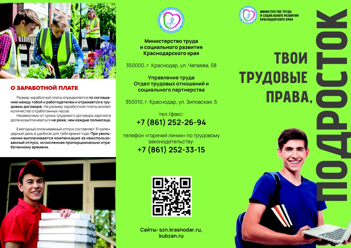Информируем вас о том, что в период с 20 по 24 октября 2025 г. проводится неделя правовой грамотности по вопросам трудовых отношений «Краснодарский край-территория без тени». В рамках тематической недели в карточках можно ознакомиться более подробно о трудовых правах подростка.