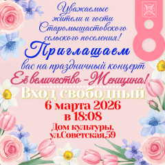 ![]() 02.03.2026 Приглашение на праздничный концерт 06.03.2026Уважаемы жители и гости Старомышастовского сельского поселения! Приглашаем на праздничное мероприятие.