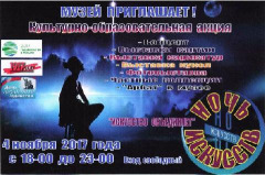 ![]() 02.11.2017 МУЗЕЙ ПРИГЛАШАЕТ НА «НОЧЬ ИСКУССТВ»04 ноября 2017 года с 18-00 до 23-00 часов, в Динском историко-краеведческом музее пройдет ежегодная культурно- образовательная акция «Ночь искусств».