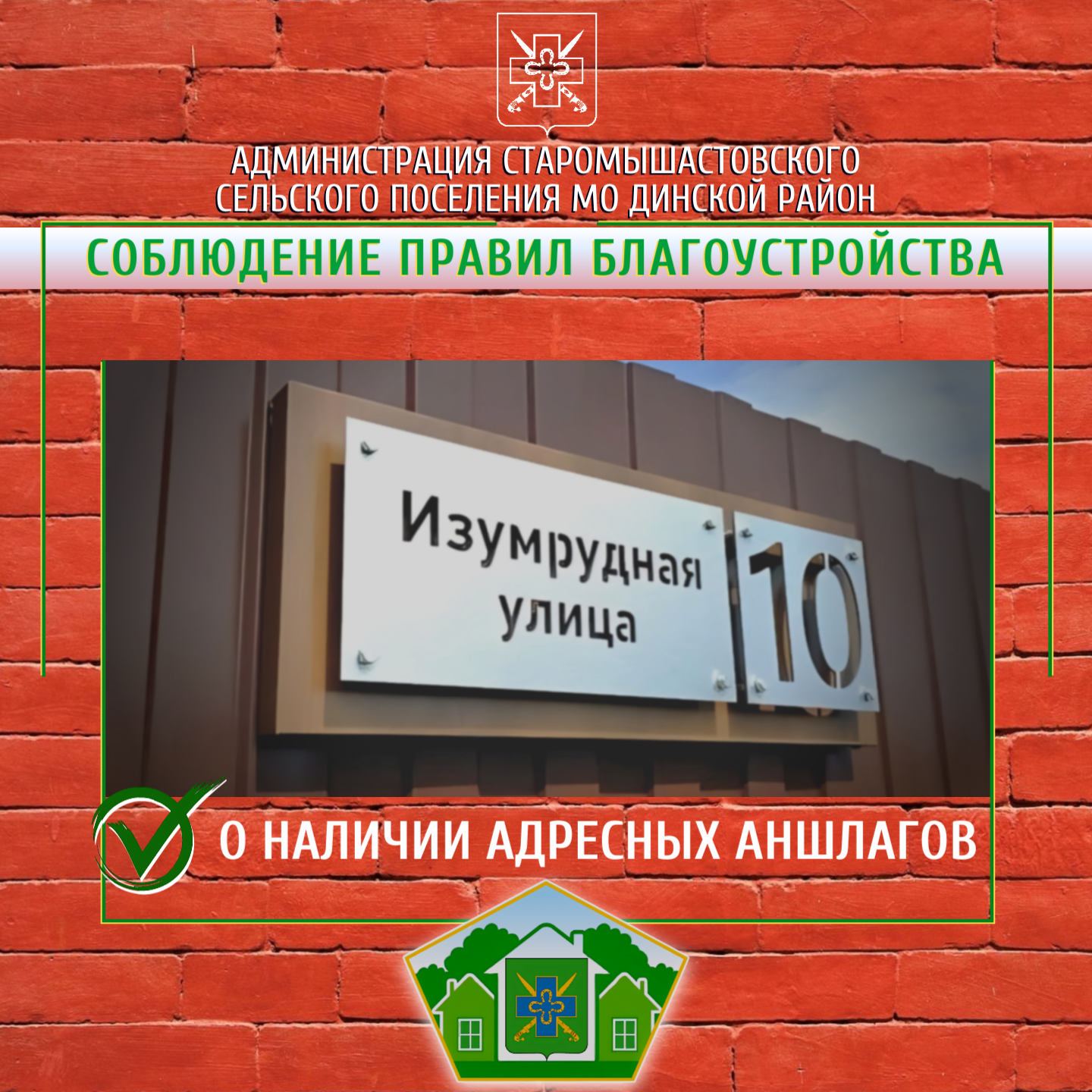 Проверьте наличие и состояние адресных табличек на ваших домах и заборах. Если аншлаг отсутствует, выцвел, погнулся или стал нечитаемым — пожалуйста, приведите его в порядок или установите новый.