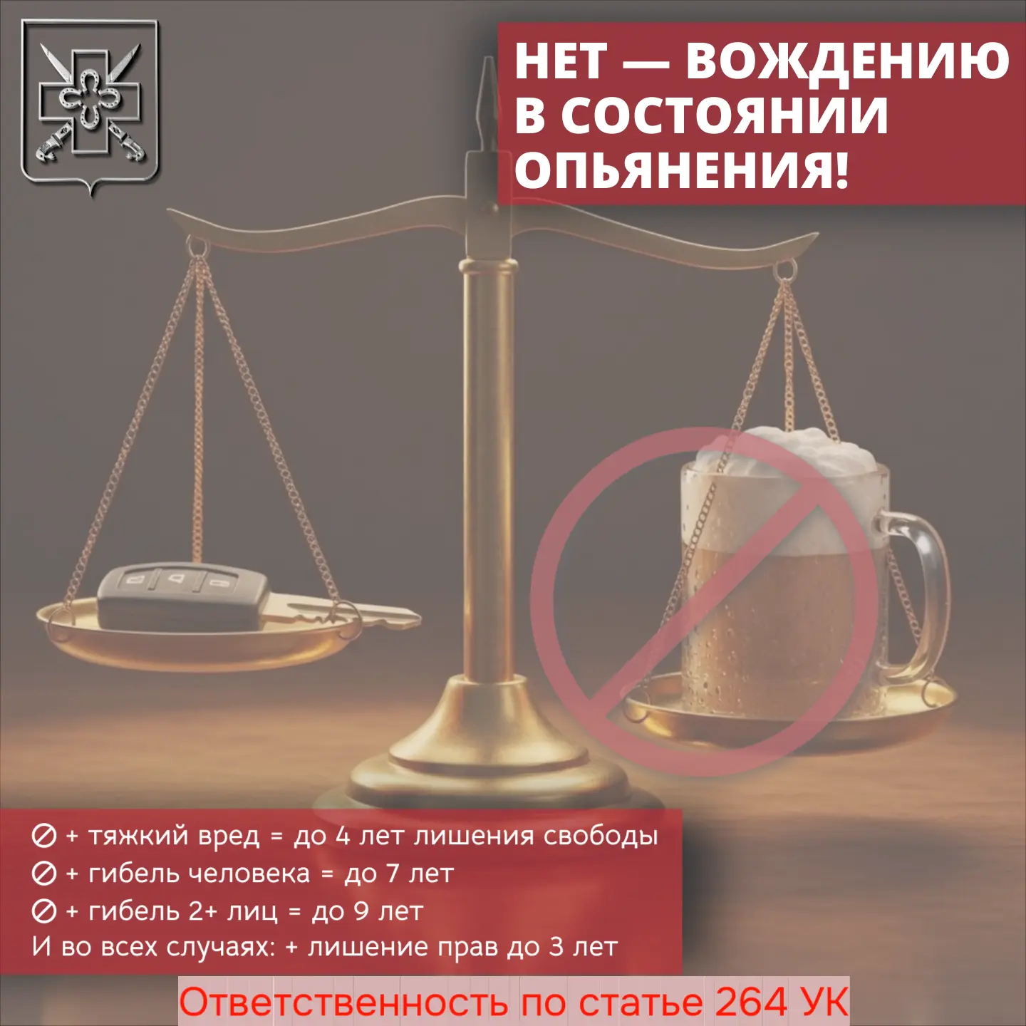 Администрация настоятельно предупреждает: садиться за руль в состоянии опьянения – значит осознанно рисковать жизнью и свободой. Цена такой поездки может стать необратимой.