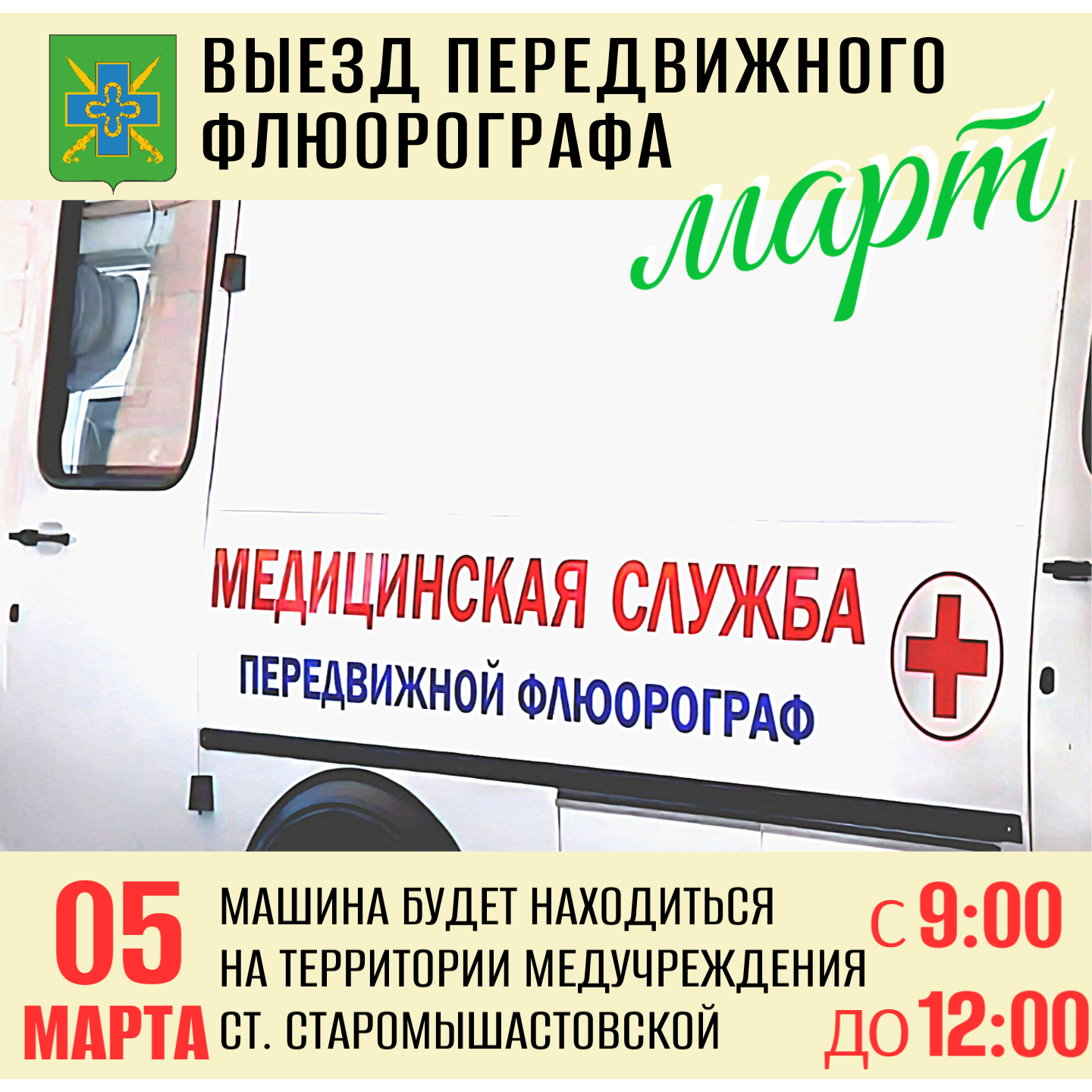 В соответствии с графиком работы по Динскому району, медицинский автомобиль будет осуществлять прием 5 марта 2026 года на территории нашей больницы (станица Старомышастовская).