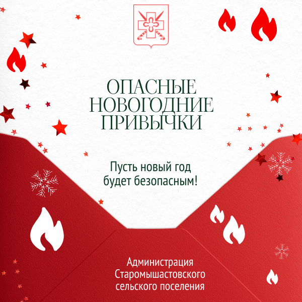 Уважаемые жители Старомышастовского сельского поселения! Совсем скоро наступит долгожданная пора новогодних праздников. МЧС России предупреждает: некоторые новогодние традиции ежегодно приводят к пожарам. Оставьте их в прошлом, чтобы праздник был по-настоящему безопасным.